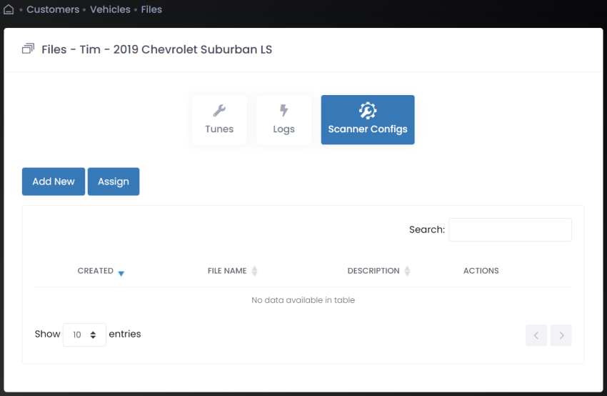 In the Actions column, click the scanner config icon for the vehicle to which you want to assign a scanner configuration. The Files page appears. |