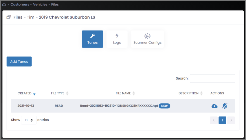 In the Actions column, click the wrench icon next to the vehicle to be tuned. The tune files page appears. |