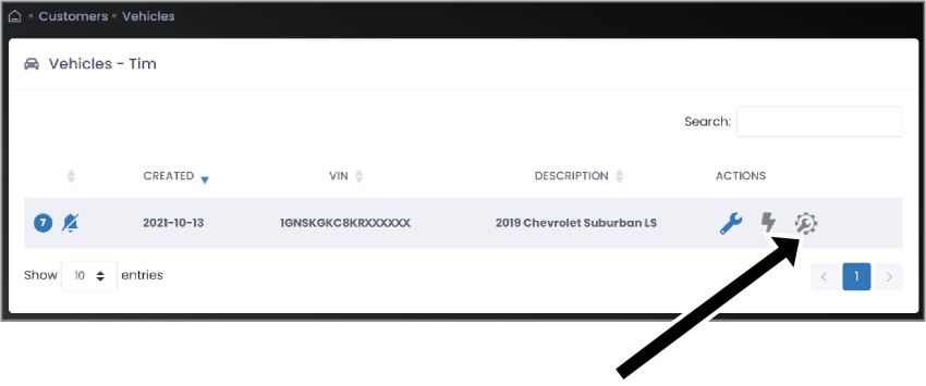 In the Actions column, click on the icon next to the customer whose files you wish to retrieve. The customer’s vehicle page appears. |
